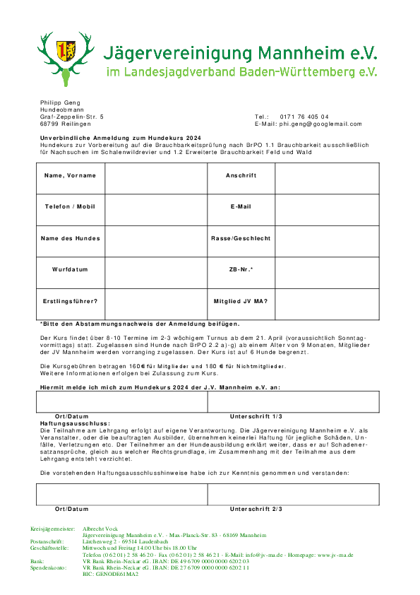 Anmeldung mit ausgefülltem Anmeldeformular per E-Mail bei Hundeobmann Philipp Geng: phi.geng(at)googlemail.com